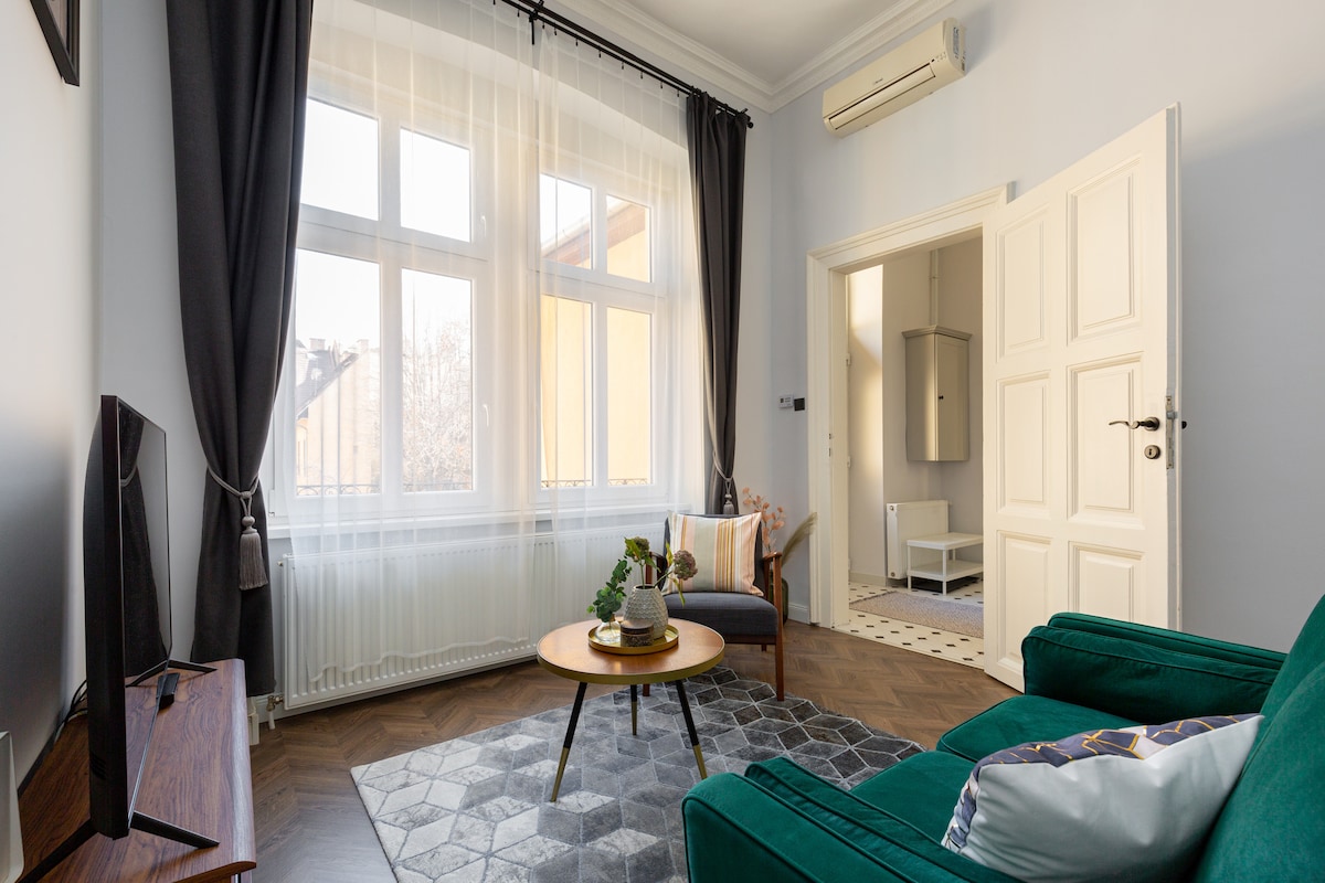 Lovely boutique suite in the Old Jewish Quarter. Perfect location to discover the city. Newly renovated, comfortable apartment in a building from 1910's. Enjoy vibrant neighborhood with nightlife, historical touch & modern living standards. This comfy suite on 75 sqm has 2 bedrooms, 2 bathrooms, living-dining area, fully equipped kitchen, WiFi, AC, intl tv chanels. 500 meters to New York Café, Great Synagogue, 800 m to Opera, Andrássy Ave., 1 km to St. Stephan Basilica or Váci utca.