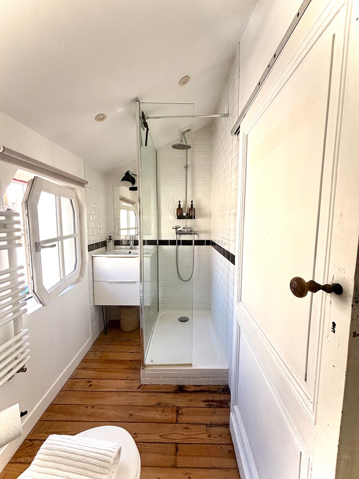 Ασυνήθιστο διαμέρισμα 44m2 στον πρώτο όροφο ενός σπιτιού σε ένα πολύ ήσυχο αδιέξοδο. Λειτουργικό κατάλυμα για 4 άτομα, για διακοπές ή για επαγγελματικούς λόγους. Παρέχουμε σεντόνια και πετσέτες. Μεγάλο σαλόνι πολύ φωτεινό (μεγάλος όγκος, ανοίγματα ανατολής-δύσης) και ανοιχτή κουζίνα. Μεγάλο υπνοδωμάτιο με κεκλιμένη οροφή και ντουλάπα. Μπάνιο με τουαλέτα και ντους 90x90. Πλυσταριό για περισσότερο χώρο αποθήκευσης. Ένας ιδιωτικός κήπος στη διάθεσή σας. Δωρεάν πάρκινγκ στον δρόμο.