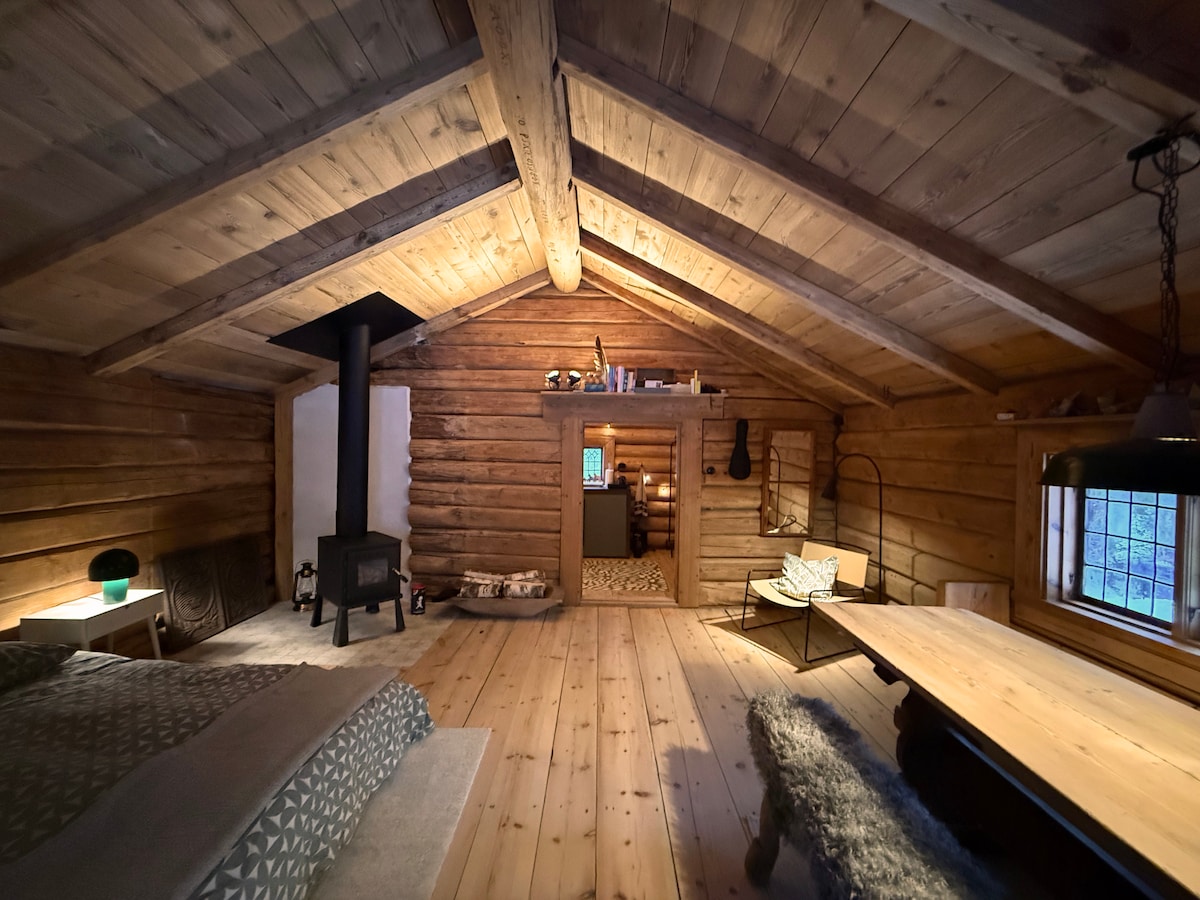 Unik A-frame bland trädtopparna i skogen - ett enkelt liv i högsta grad. Upptäck harmonin i vår förtrollande skog, inbäddad bland naturens skönheter, där varje dag känns som ett med naturen. Njut av vind och väsen från naturen till den sprakande kaminen. Laga din mat över grill eller kokplatta. Total avkoppling från allt annat som haft betydelse! Här laddar du om batterierna till fullo. Enkel toalett och dusch ca 90 meter ifrån. Endast dusch under sommaren. Max plats för 2 personer.