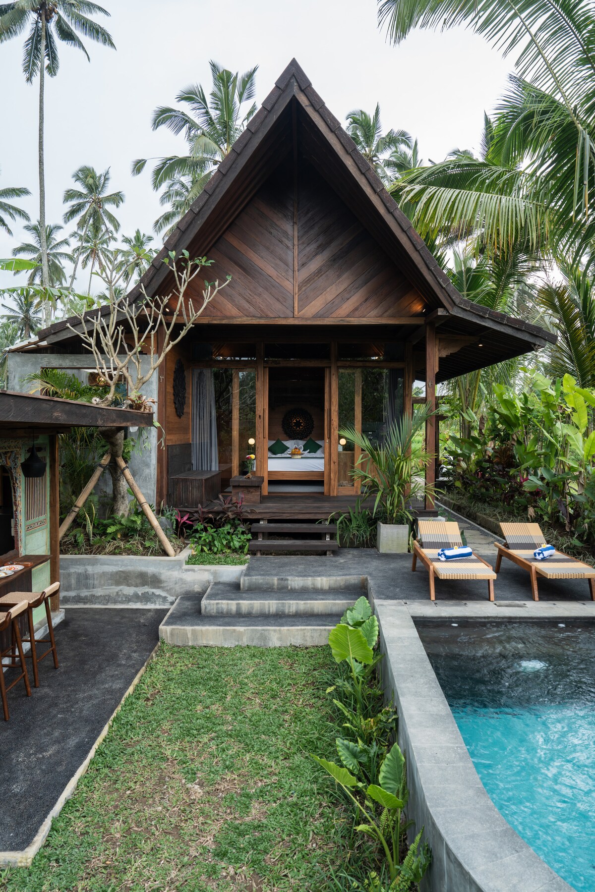 Romantic nature retreat in peaceful Tegallalang! 1-bedroom villa with private pool, kitchen & fire pit. Semi-outdoor bathroom embraces our unique nature concept among rice fields. Perfect for couples seeking authentic Balinese village life with modern luxury. Includes breakfast for 2. Experience magical sunsets, starlit evenings by your fire, and refreshing private pool dips surrounded by lush greenery. Your perfect escape awaits!”