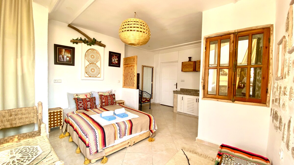 Découvrez le charme authentique de notre suite berbère, un espace ouvert conçu pour votre confort et votre détente. Elle comprend : • Un lit double pour des nuits paisibles, • Toilettes et douche privées pour votre intimité, • Une petite cuisine avec kitchenette • Un coin détente pour savourer un thé ou un café . Le tout agrémenté d’une vue spectaculaire sur la mer, parfaite pour des moments de relaxation et des souvenirs . Laissez-vous séduire par l’ambiance magique de cette suite berbère