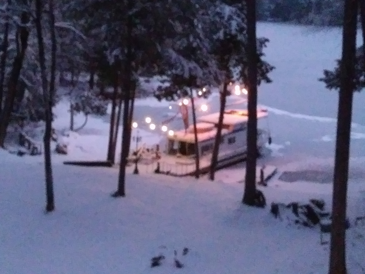 Have a whimsical(some call it Exciting) adventure at the Riverboat Fantasy in Chaffey's Lock! If you are looking for something unique, you have found it! This place has it all, including a private hot tub on a 2nd floor balcony, a hot rock sauna with a surprise out side shower, a castle wall, outdoor fire-pits, houseboat to play-in or on to feed the fish from, a throne, a very large private deck facing the lake and a porch on the other side, and many fanciful decorations everywhere you look!