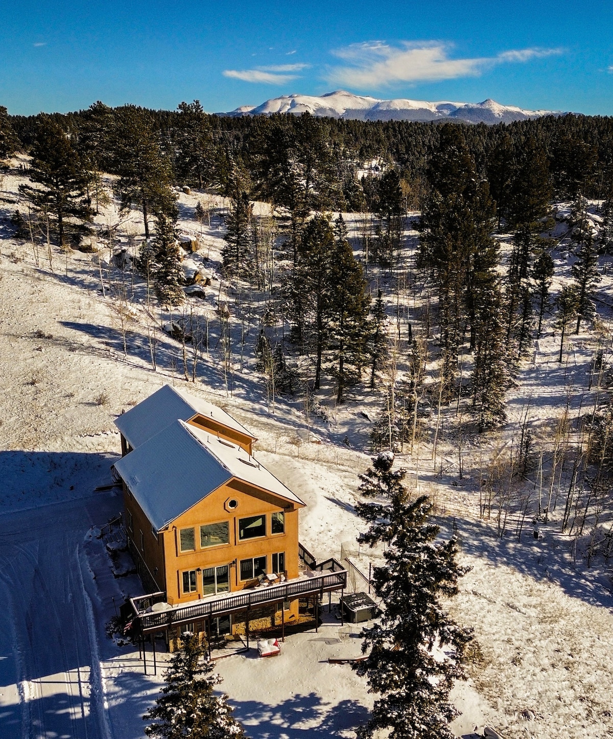 Modern meets mountain in this gorgeous getaway. Amazing views of “Purple Mountains Majesty”, Pikes Peak, as referenced in the famous anthem. All VIEW pictures taken from the deck! Sledding, and snowshoeing/cross country skiing!! -HOT TUB ⇹ PLAY GROUND ⇹ GAME ROOM: Air Hockey, Ping Pong, Foosball, Pool Table, and Corn hole. ⇹ Luxury Shower: 6 heads & heated floors ⇹ Pleasant Outdoor indoor spaces w/ firepit. ⇹ Activities: See Guidebook, my pictures, or TripAdvsior. -Complimentary Snow removal