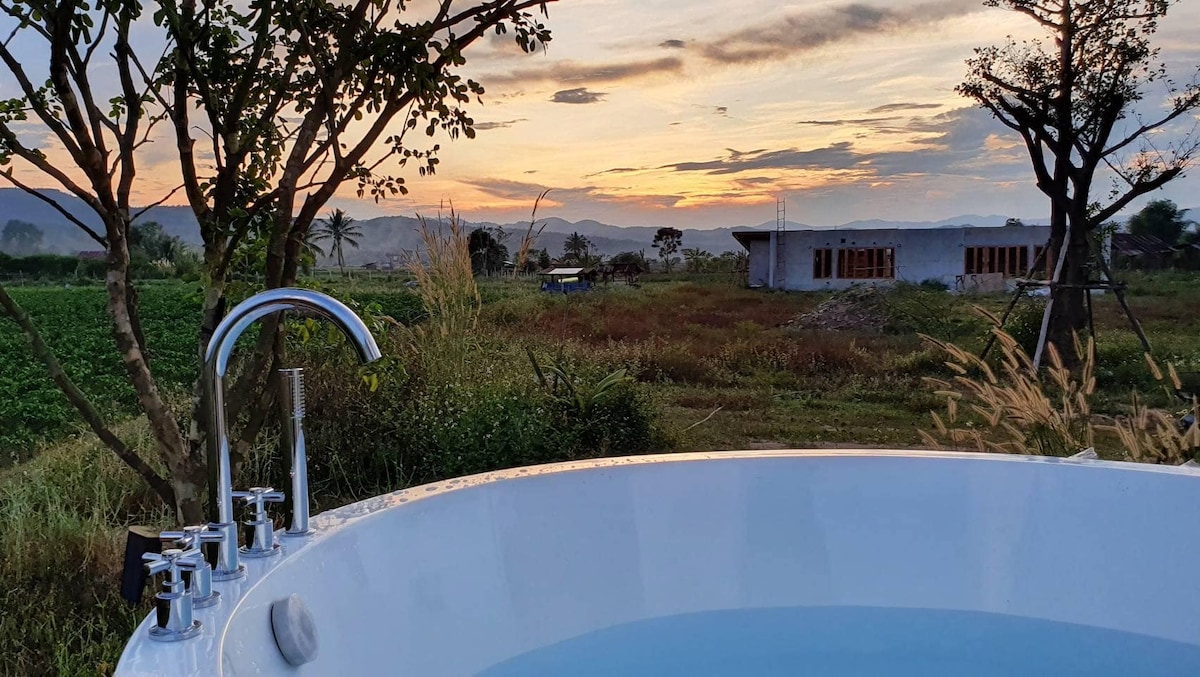 บ้านธาราถูกออกให้มีสไตล์เรียบง่าย มีชานระเบียงในร่ม ห้องน้ำเห็นวิวทุ่งนาด้านข้าง อ่างฟองโฟมวิวขา ลานนั่งเล่นระเบียงกลางแจ้งชิดทุ่งนา มาพร้อมเตียงเดี่ยว 3.5ฟุต 2 เตียง นอนสบายเติมพลังกายและใจในที่พักเงียบสงบและมีสไตล์ ล้อมรอบด้วยทุ่งนา ภูเขา และลำธาร