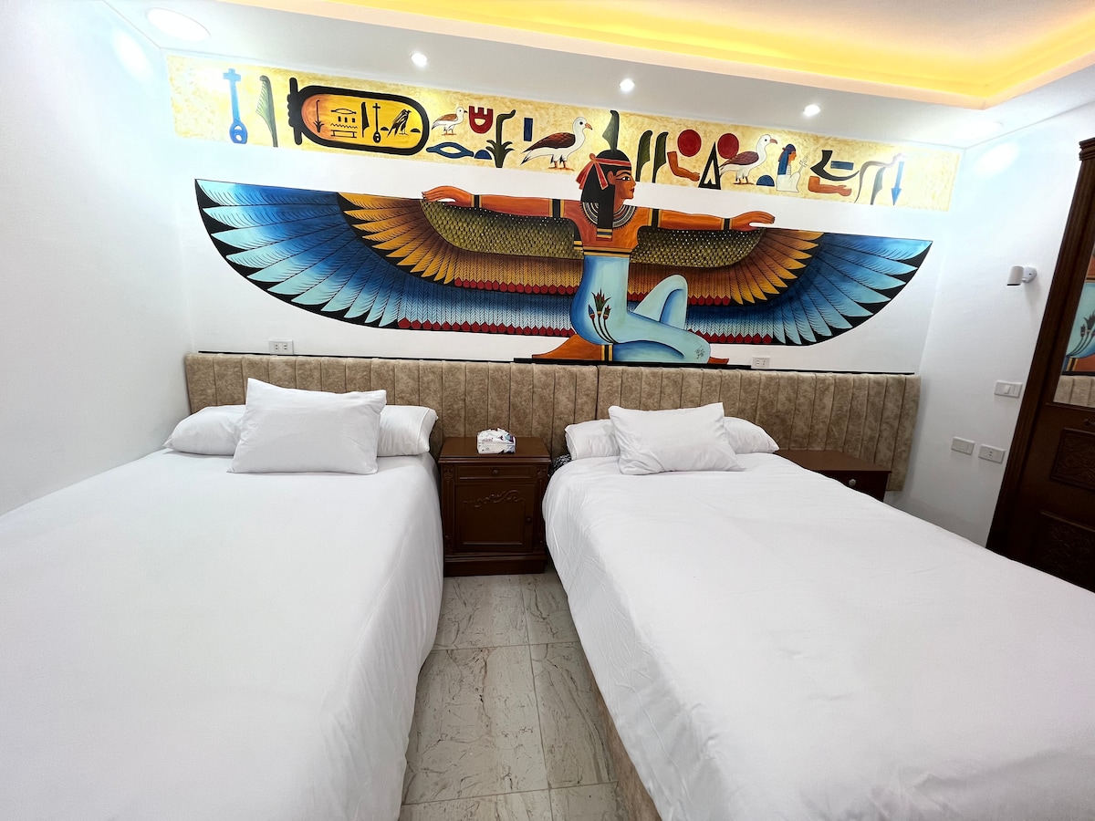 Μείνετε στο Φαραωνικό Σπίτι, που βρίσκεται ακριβώς μπροστά από τη νέα πύλη των Πυραμίδων της Γκίζας στην πολυσύχναστη περιοχή του Κήπου των Πυραμίδων (Hadayek El Ahram). Ο ξενώνας διαθέτει μοναδικά χειροποίητα ζωγραφισμένα αρχαία αιγυπτιακά έργα τέχνης και προσφέρει υπέροχη θέα στις πυραμίδες από το μπαλκόνι και δύο δωμάτια. Απολαύστε τον πρωινό σας καφέ ή τα γεύματά σας ενώ παρακολουθείτε την ανατολή και το ηλιοβασίλεμα πάνω από τις Πυραμίδες. Μια τέλεια διαμονή για ταξιδιώτες που αναζητούν άνεση, πολιτισμό και αξέχαστη θέα.