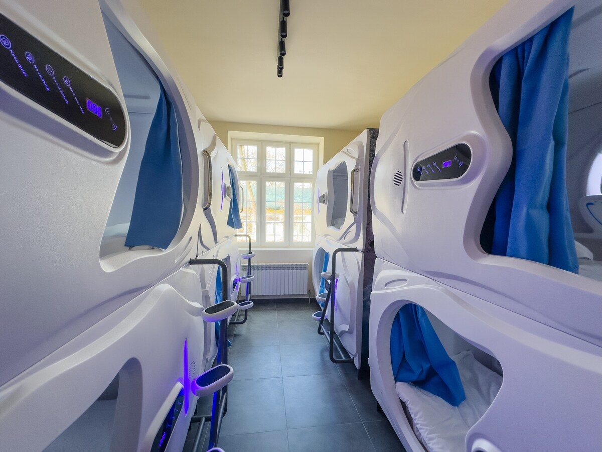 Hostel Kapsułowy w centrum Warszawy dla 114 gości. Komfortowe kapsuły wyposażone w dwa gniazda zasilające, regulowane oświetlenie, wentylację oraz bardzo wygodny materac, zamykana automatycznie roleta daje bezpieczeństwo podczas snu. W 6 łazienkach jest 37 umywalek, 17 pryszniców, 16 toalet i 5 pisuarów. Profesjonalna obsługa oraz całodobowa recepcja chętnie pomaga gościom. Obiekt położony w cichym zakątku śródmieścia idealnie nadaje się na bazę wypadową do pieszego zwiedzania centrum Warszawy.