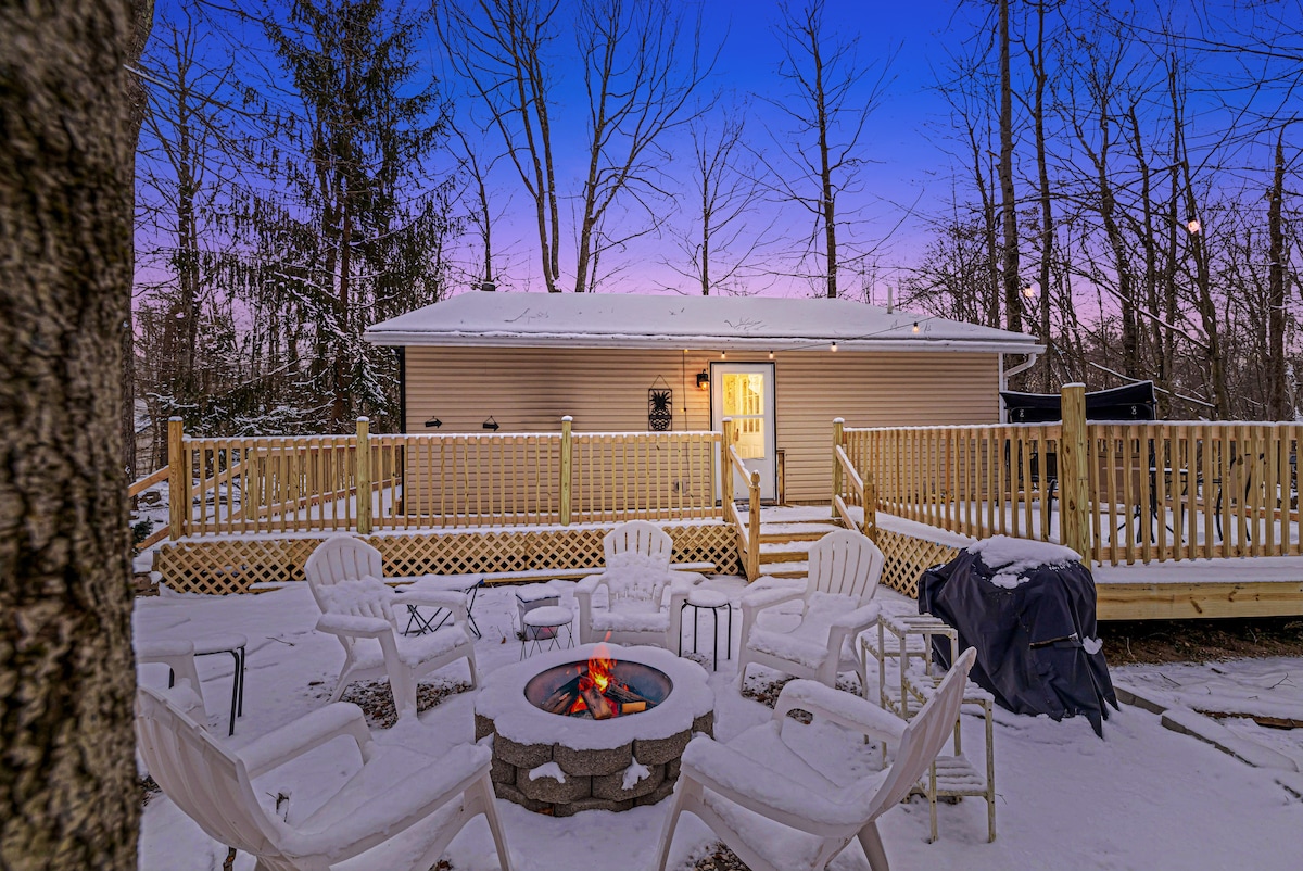 Αποδράστε σε μια άνετη φθινοπωρινή απόδραση κοντά στο Kalahari, το Mount Airy Casino, τα Crossings Outlets, τη λίμνη Wallenpaupack και το Tobyhanna State Park 2 μίλια μακριά με φθινοπωρινά φύλλα και βουνό, θέα στη λίμνη, άγρια ζωή και σημεία για πικνίκ. Φωλιάζει σε έναν τραχύ ιδιωτικό δρόμο. Αυτό το καταφύγιο σε στυλ σπα διαθέτει μπανιέρα, ντους οροφής, έξυπνα φώτα, κουζίνα με έξυπνη κουζίνα, πολυτελή κρεβάτια, καθρέφτες LED με συγχρονισμό μουσικής και ρετρό ηλεκτρονικά παιχνίδια. Ιδανικό για ζευγάρια, αποδράσεις γενεθλίων ή οικογένειες που αναζητούν μια ήσυχη διαμονή στο Poconos με σύγχρονες ανέσεις.