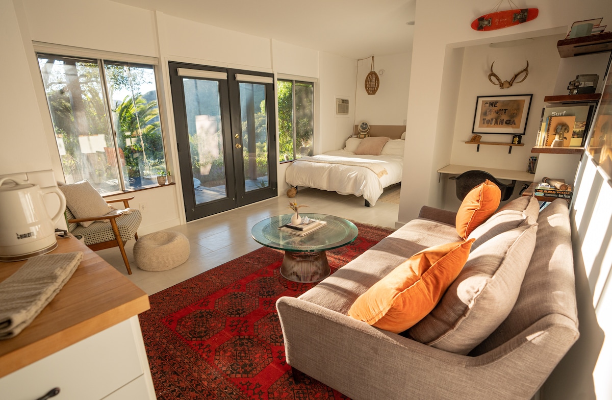 Αποδράστε στο Topanga Canyon, το μεγαλύτερο κρατικό πάρκο εντός των ορίων της πόλης στον κόσμο, άνετα σε αυτό το γαλήνιο, ιδιωτικό και εκπληκτικό μπανγκαλόου 2 υπνοδωματίων που βρίσκεται μόλις 5 λεπτά με τα πόδια από τα μονοπάτια του πάρκου και 12 λεπτά από την παραλία! Απολαύστε την ελευθερία να περπατήσετε στα μονοπάτια, μερικά με θέα στον ωκεανό. Χαλαρώστε στο αίθριο με ένα δωρεάν μπουκάλι κρασί, απολαύστε τις αιώρες, το τζακούζι, το σέρφινγκ ή παρακολουθήστε τις αγαπημένες σας εκπομπές από κάθε δωμάτιο. Μπορείτε ακόμη και να κάνετε κράτηση για μασάζ στην ιδιοκτησία (σε εκκρεμότητα)!