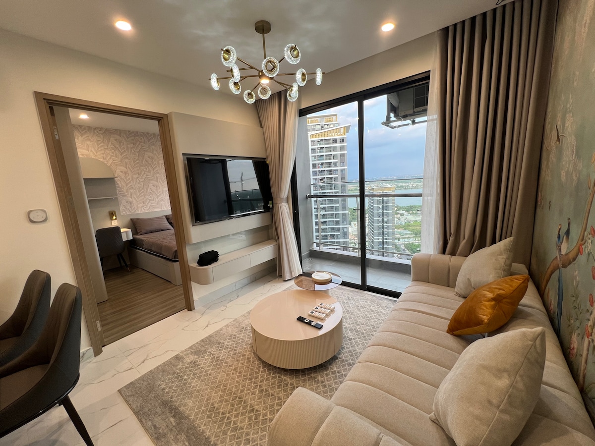 Ζήστε την πολυτέλεια δίπλα στο ποτάμι στο Vinhomes Grand Park. Ξυπνήστε με γαλήνια θέα στο ποτάμι σε αυτό το κομψό διαμέρισμα 1BR. Ιδανικό για ταξιδιώτες για επαγγελματικούς σκοπούς και ζευγάρια που αναζητούν σύγχρονη άνεση με μποέμ κομψότητα.