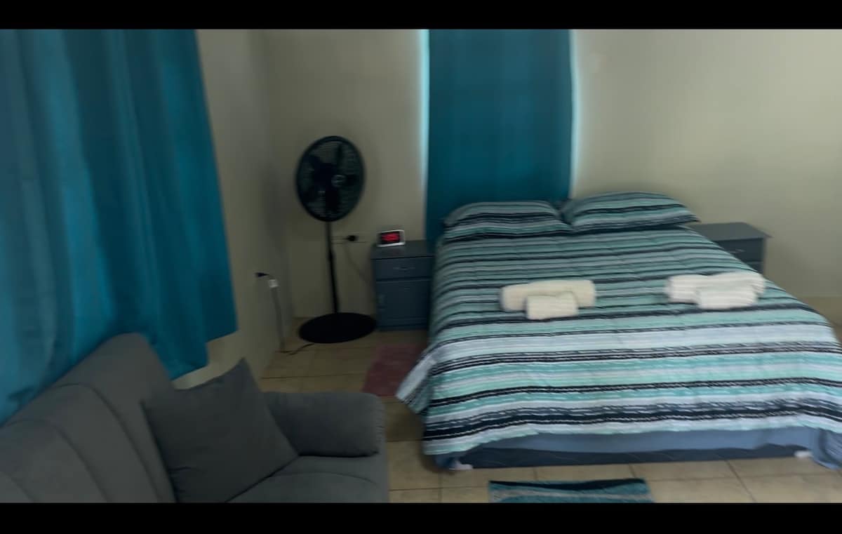 One bedroom self contained flat with en suite bathroom. Brightly decorated, with essential amenities. It is conveniently located with easy access to gyms, savannahs, and for the more religious guests there are many places of worship.. It is accessible to the city, the north coast beaches, Mount St Benedict , the Caroni Bird Sanctuary and the south of Trinidad by public transportation. The space can accommodate 2 persons. Fans are provided . No pets. No smoking . Yes to Hot and cold water.