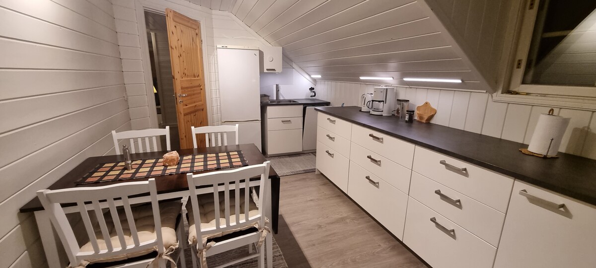 Kun 25 min. (med bil) fra sentrum, flott natur, fin utsikt og muligheter for å se Aurora borealis. Koselig loft med 2 soverom, kjøkken, liten stue og bad. Egen inngang. Det er dobbelseng (150x200) på begge rom. Leiligheten er godt utstyrt med det man trenger for et ferieopphold.