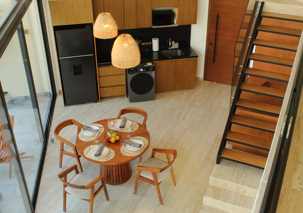 Ανακαλύψτε το Aflora Jungle Modern Loft, όπου ο μοντέρνος σχεδιασμός συνδυάζεται με τη φύση. Ολοκαίνουργιο διαμέρισμα στην Aldea Zama με υπέρδιπλο κρεβάτι, κουζίνα υψηλής ποιότητας, κομψό μπάνιο και ιδιωτική βεράντα. Απολαύστε μια πισίνα σχεδιαστών με κανάλι nado, γκουρμέ εστιατόριο, συνεργασία, γυμναστήριο, δωμάτιο γιόγκα και δωμάτιο πλυντηρίου. Ασφάλεια όλο το 24ωρο, 7 ημέρες την εβδομάδα και δωρεάν πάρκινγκ. Ιδανικό για ρομαντική απόδραση ή παρατεταμένη διαμονή.