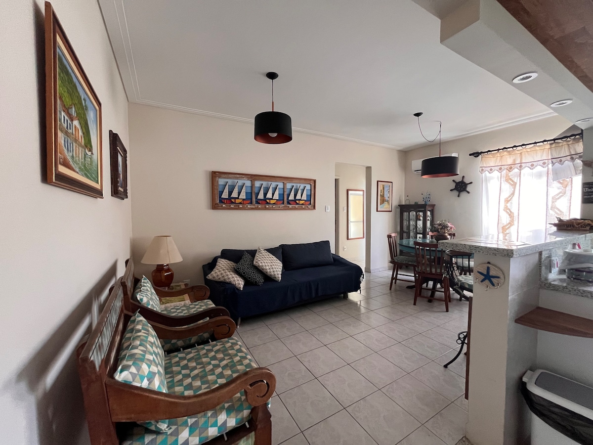 Apto com ar condicionado nos dois quartos e na sala e cômodos amplos, todo reformado. Quarto de casal com cama Queen, colchão de molas de última geração e lençóis de 200 fios. Ambos os quartos equipados com janelas antirruído. Cozinha completa. Ótima localização: fica na av. da praia e o entorno é repleto de restaurantes, sorveterias, bares, supermercados, farmácias, padaria, feirinha de artesanato, igreja matriz, tudo feito a pé. O estacionamento fica na rua atrás do prédio e está incluído.