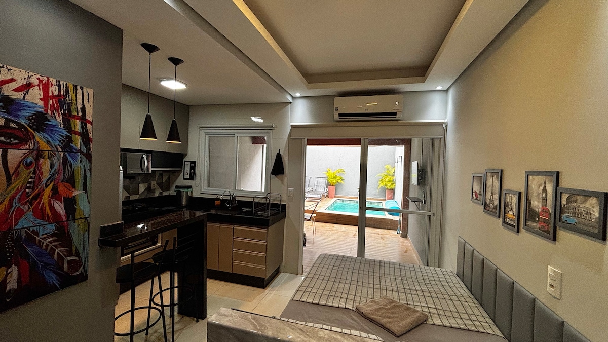 - Proibido festas/reuniões no local. Studio privativo em um pequeno condomínio de studios independentes, mobiliado com ar cond. frio, cama casal, sofá retrátil, smart TV 50”, guarda-roupas, cozinha completa e quintal com piscina funda (1,50m) de água aquecida por placa solar (necessário dias de sol para aquecer). Disponibilizo toalha, lençol, cobertor, shampoo, sabonete. Acomoda bem 2 pessoas podendo estender mais uma para dormir no sofá retrátil (preencha a quantidade de hospedes na reserva).