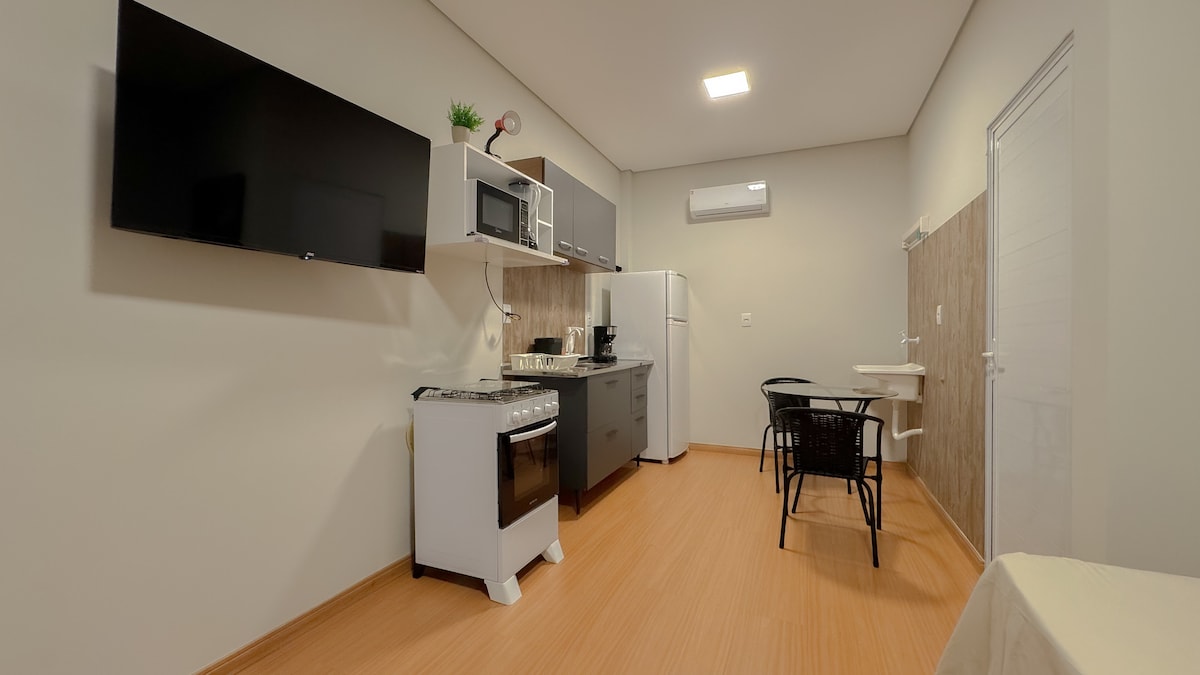 - Proibido festas/reuniões no local. Studio privativo em um pequeno condomínio de studios independentes, mobiliado com ar cond. frio, cama casal, sofá retrátil, smart TV 50”, guarda-roupas, cozinha completa e quintal com piscina funda (1,50m) de água aquecida por placa solar (necessário dias de sol para aquecer). Disponibilizo toalha, lençol, cobertor, shampoo, sabonete. Acomoda bem 2 pessoas podendo estender mais uma para dormir no sofá retrátil (preencha a quantidade de hospedes na reserva).