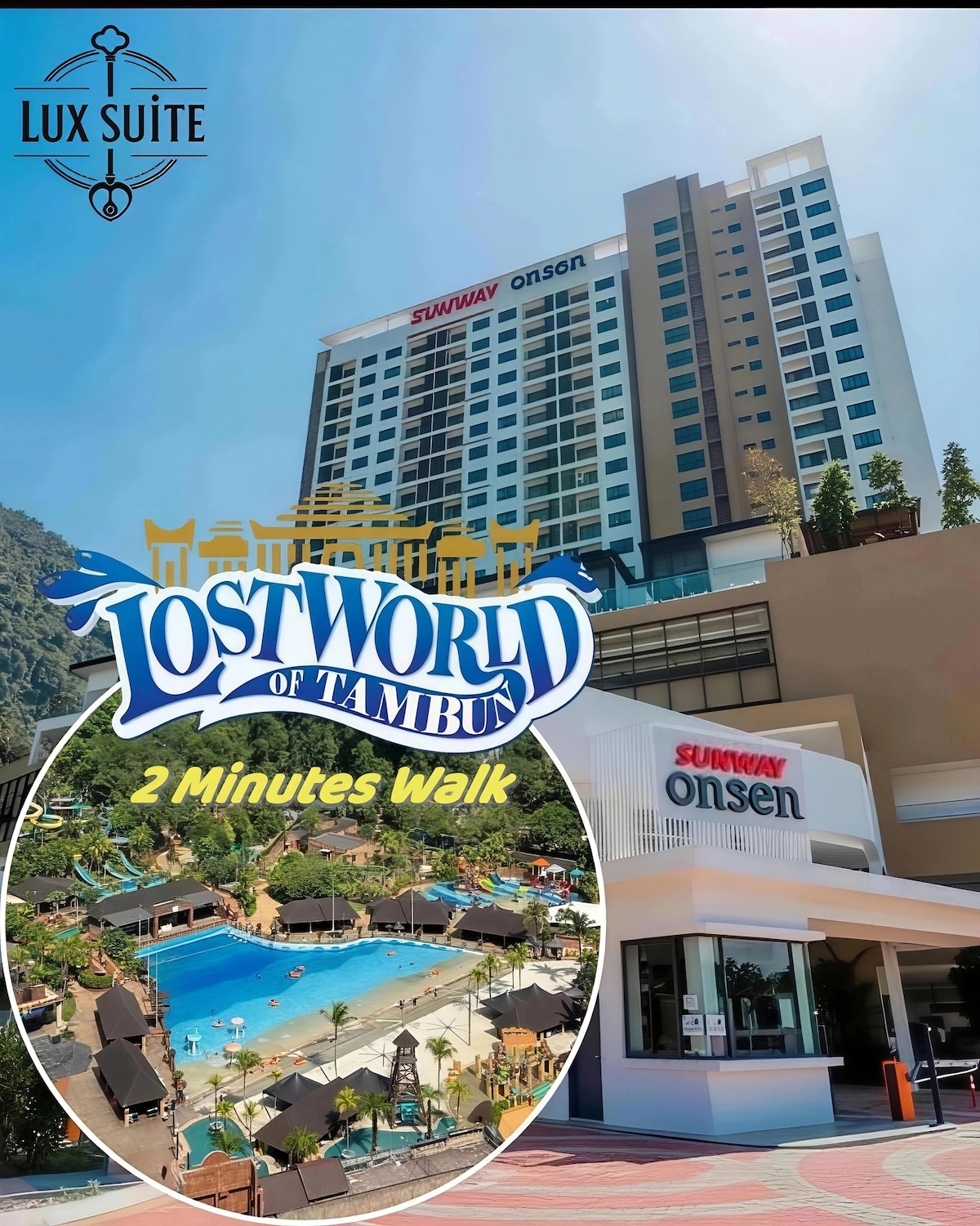 Sunway Onsen Suites, κομψές και μοντέρνες οικιστικές σουίτες για οικογένειες ή ομάδες έως και 8 ατόμων που αναζητούν έναν χώρο για να αγκαλιάσουν το καλύτερο ρυάκι και τους λόφους της φύσης. 2 υπνοδωμάτια (Κάθε δωμάτιο με δύο υπέρδιπλα κρεβάτια) 2 μπάνια με ντους με θερμοσίφωνα, σαμπουάν και αφρόλουτρο. 2 Χώροι στάθμευσης Beautiful Sunway Tambun Lost World Them Park View