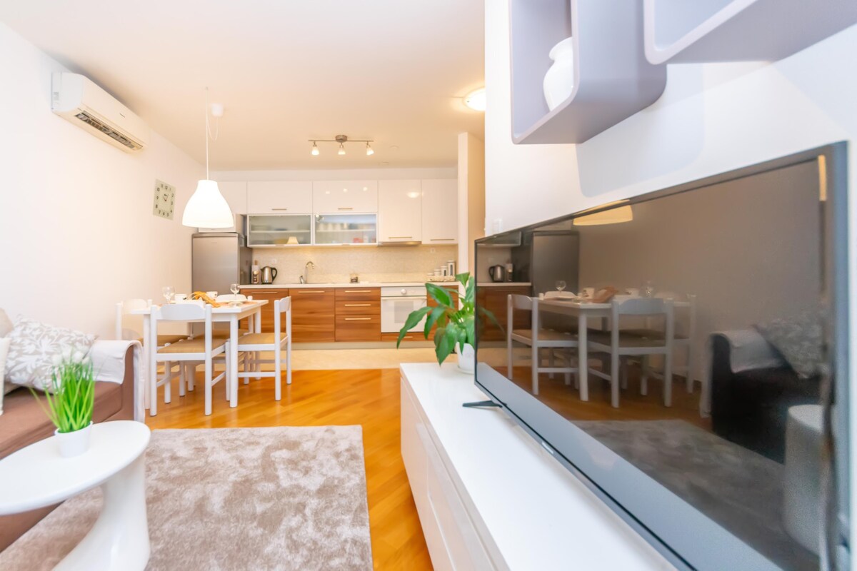 Cijeli stan je potpuno nov ,vrlo svijetao i prostran sa 70m2 prozračnog prostora. Dvije velike sobe:soba br.1 sa super king krevetom za 2 osobe i soba br.2 sa dva kreveta za jednu osobu.U velikom dnevnom boravku nalazi se velika kutna garnitura s mogućnošću razvlačenja za dva dodatna ležaja.Kuhinja je potpuno opremljena za svakodnevno kuhanje. Svaka soba ima zasebni klima-ure Savršeno mjesto kao baza za istraživanje svih povijesnih spomenika, izvrsnih restorana i barova. Blizu Zadarskog mosta.