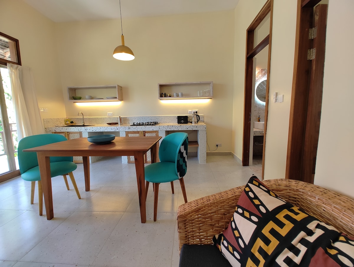 Αυτό το εκπληκτικό, φωτεινό διαμέρισμα είναι όμορφα επιπλωμένο σε μοντέρνο αφρικανικό στιλ και βρίσκεται μέσα σε έναν καταπράσινο τροπικό κήπο. Σε μια ιδιοκτησία με θέα στη λευκή παραλία της Τζαμπιάνι, ζήστε το μοναδικό μείγμα σύγχρονης άνεσης και πλούσιας αφρικανικής κουλτούρας, χειροποίητων ξύλινων επίπλων και ζωντανών έργων τέχνης. Τα μπάνια είναι πολυτελή και μοντέρνα και διαθέτουν μοναδικές πινελιές, όπως γυάλινα πλακάκια και ελαφριές πινελιές. Βουτήξτε στην αστραφτερή πισίνα του ακινήτου για μια δροσιστική απόδραση ή απολαύστε ένα ποτό στο τίκι μπαρ μας.