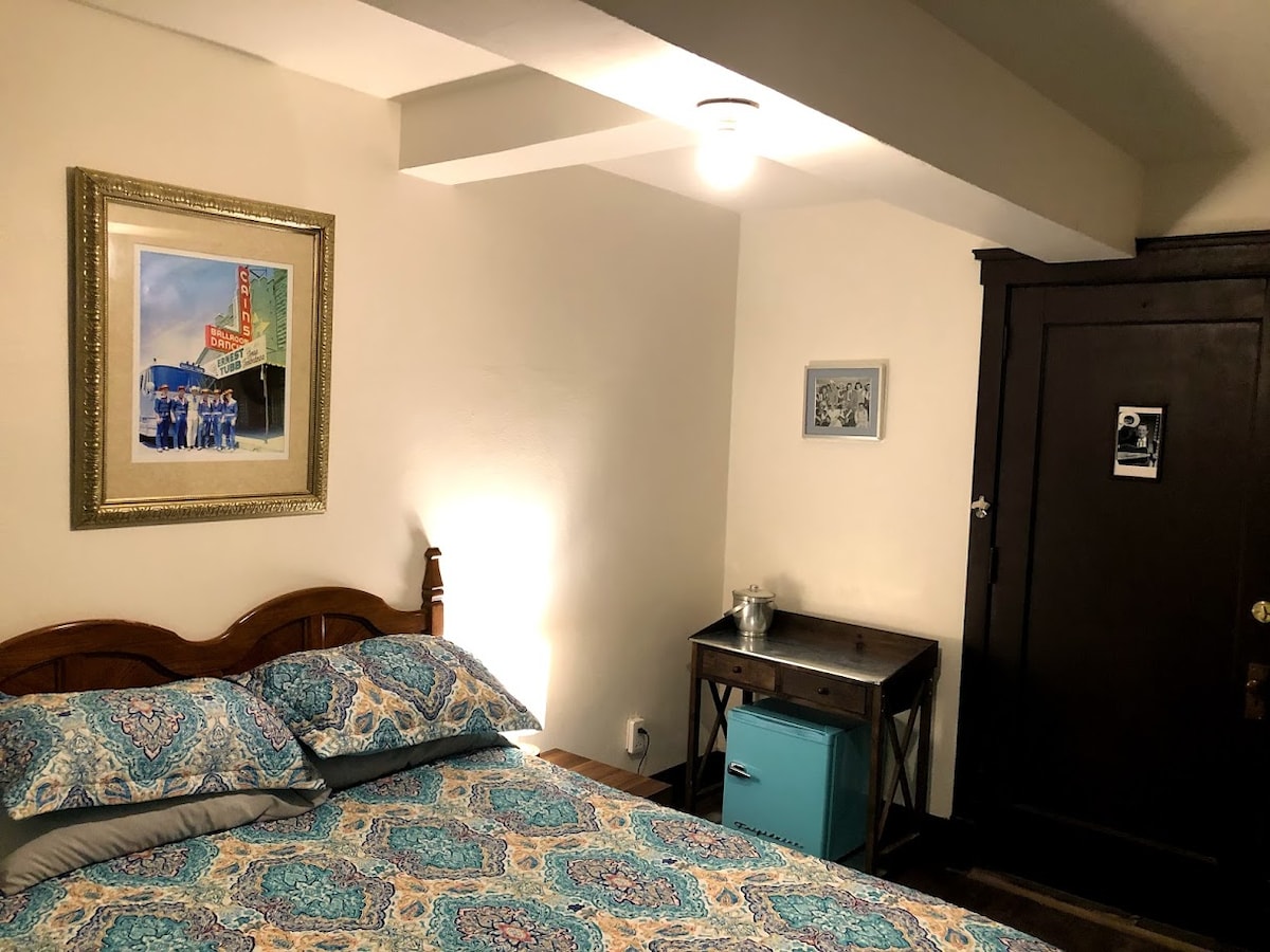 This budget-friendly room is perfect for solo travelers or couples. It features a vintage blue velvet double bed, a cozy dining table, and a wall-mounted projector for movie nights. You'll also find a coffee maker and mini fridge for your convenience. Please note: this room does not include a private bathroom. Guests share two hallway baths and a private outdoor garden shower with hot water.
