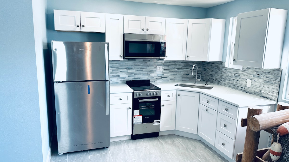 This second-floor studio apartment offers convenient access, being a mere five-minute walk from Upham Beach, the retail establishments on Corey Avenue, Waterside Restaurants, and a variety of other dining and shopping venues. The accommodations feature a king-sized bed, a dedicated sitting area, a versatile space for work or dining, a refrigerator, microwave, toaster, coffee maker, kitchen sink, and a deck ideal for enjoying morning coffee.