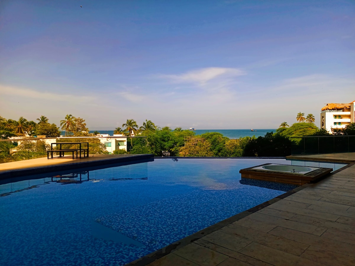 Διαμέρισμα στον δέκατο όροφο με θέα στον ωκεανό. Βρίσκεται στο Pozos Colorados και προσφέρει πρόσβαση σε πισίνες, τζακούζι, σάουνα, ατμόλουτρο, γυμναστήριο, αίθουσα παιχνιδιών, αίθουσα μασάζ και περίπτερα. Όλα αυτά με κράτηση μέσω μιας εφαρμογής. Περιλαμβάνει κλιματισμό, εξοπλισμένη κουζίνα, σίδερο και πιστολάκι μαλλιών. Ιδανικό για χαλάρωση, τηλεργασία ή οικογενειακή διαμονή. Στον αυτοκινητόδρομο Caribbean, 30 λεπτά από το πάρκο Tayrona, 17 λεπτά από τη Santa Marta, 13 λεπτά από το El Rodadero και 11 λεπτά από το αεροδρόμιο. Η τιμή περιλαμβάνει βραχιολάκια και καθαρισμό.