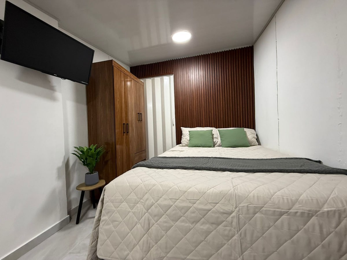 Disfruta de un espacio pequeño pero perfectamente diseñado para tu comodidad. El espacio ofrece todo lo necesario para una estancia práctica y confortable, ideal para viajeros solos o parejas. Cama tamaño full (1.35 x 1.90 m), smart TV, refrigeradora, microondas, licuadora, horno tostador, filtro de agua, cocina completamente equipada, escritorio, wifi y closet. El baño incluye ducha, agua caliente, secadora de cabello, shampoo, acondicionador, jabón, toallas y papel higiénico.