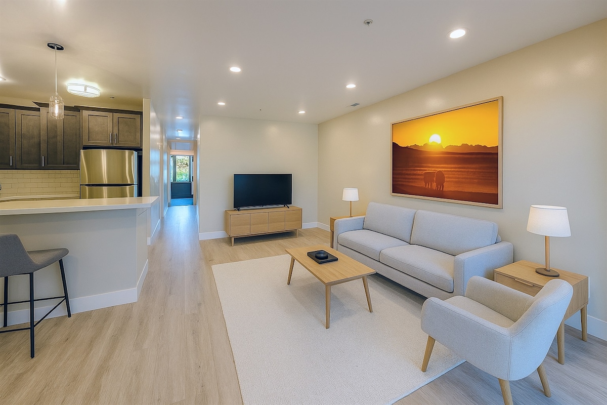 Spacious 2BR/2BA boutique suite featuring a king bedroom with private en-suite bath, a queen bedroom, and modern high-end finishes throughout. Enjoy a full kitchen, private in-suite washer and dryer, and a comfortable living area with a large-screen Smart TV. The king bedroom also features a large Smart TV. Pet-friendly for small dogs with prior approval, plus our signature waffle breakfast to start your mornings right — a guest favorite!