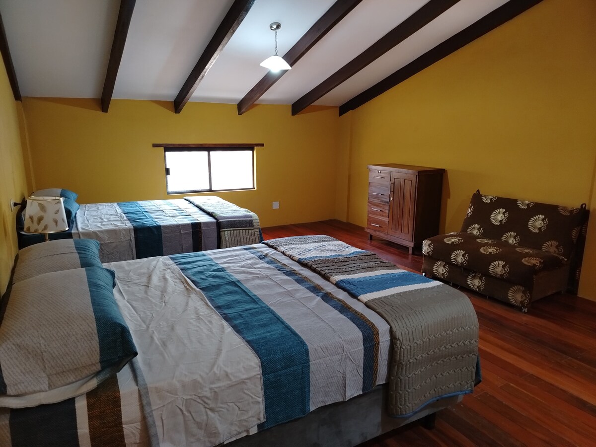 Nuestra cabaña ofrece comodidad y privacidad: un dormitorio principal con baño privado, y un mezzanine con dos camas amplias. Cocina equipada, comedor, sala con chimenea para noches frescas. Jardín con área de parrilla para churrascos. Garaje incluido. A solo cinco cuadras de la plaza principal, con vistas impresionantes. ¡Vacaciones inolvidables en Samaipata te esperan aquí!