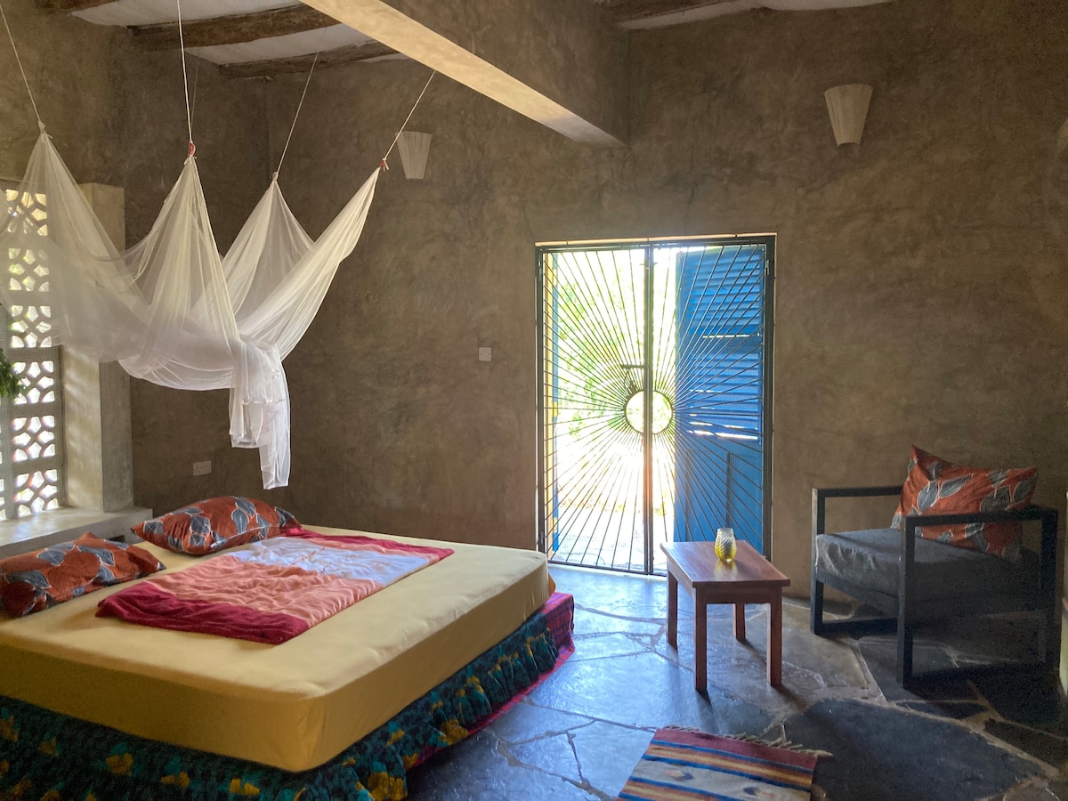 Forget your worries in this spacious and serene space on the Kenyan Coast. In this quiet and rural area you can calm down, soak in nature at its best and relax. Our place welcomes you with two spacious bedrooms and two en-suite bathrooms, a big open plan kitchen and living room, and a porch that goes around the entire house. Our house has its own power and water supply. The water is sweet and cool. The house is located on a big plot with fruit trees and a vegetable garden around it.