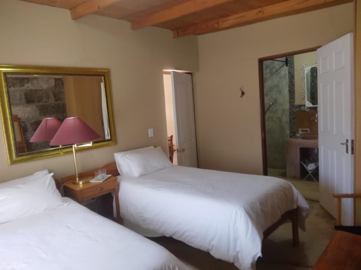 Enjoy a peaceful farm stay in our self-catering cottage with a private garden. It features two en-suite bedrooms, a fully equipped kitchen, and a cozy living room with an indoor fireplace. Relax outside with a braai, firepit and nearby dam. Explore hiking, walking, mountain biking, or fishing, and feeding our friendly horses. Guests enjoy secure parking, free WiFi, 24-hour access, and a swimming pool. We are pet friendly. Braai packs, potjie packs, side dishes, and wood are available on order.