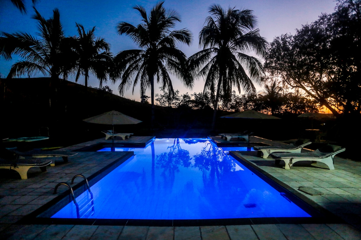 Cabana com cinema, banheiras e rede suspensa