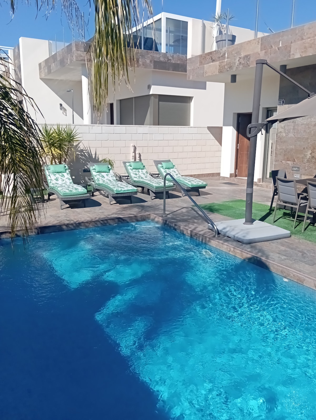 Private Luxury Villa Tropical Garden With Waterfall, large Pool, Full outdoor kitchen with seating area, Bar , BBQ, jacuzzi chill area, Rated best location in Torrevieja close to Beach, Waterparks, Bars & Restaurants, just 5 mins walk to Sea the beautiful ( Salt Lakes ) Your family will be close to everything when you stay at this centrally-located place Nature reserve featuring salt lagoons known for pink lakes. if 13 or more guests we will add more beds to the rooms. will need notice.