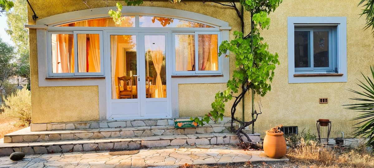 Appartement calme situé au rez de chaussée de notre maison. Entrée independante. Climatisé, grand salon avec cuisine ouverte équipée, vous y trouverez la base pour cuisiner (huile/sel/poivre...).Grande salle de bain avec douche à l'italienne (draps de bain fournis). 2 grandes chambres avec avec 1 lit en 1 60. Linge de maison fournis. Terrasse extérieure couverte avec barbecue; accès à la piscine et au jardin. Nous vous réservons l'accès à la piscine lorsque vous êtes presents.