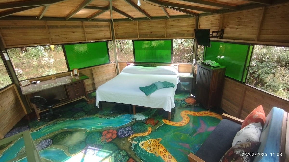 Hermoso lugar con vista al bosque y al valle. Cocina equipada para 4 Personas. Zona de terraza con BBQ. Jacuzzi en terraza totalmente cubierto. Video proyector para entretenimiento Terraza con vista panoramica. Estacionamiento Privado Camas comodas, Espacio de trabajo, zona de Tv. Baño con agua caliente constante, ofrecemos articulos basicos como jabon, papel higienico, toallas, etc.