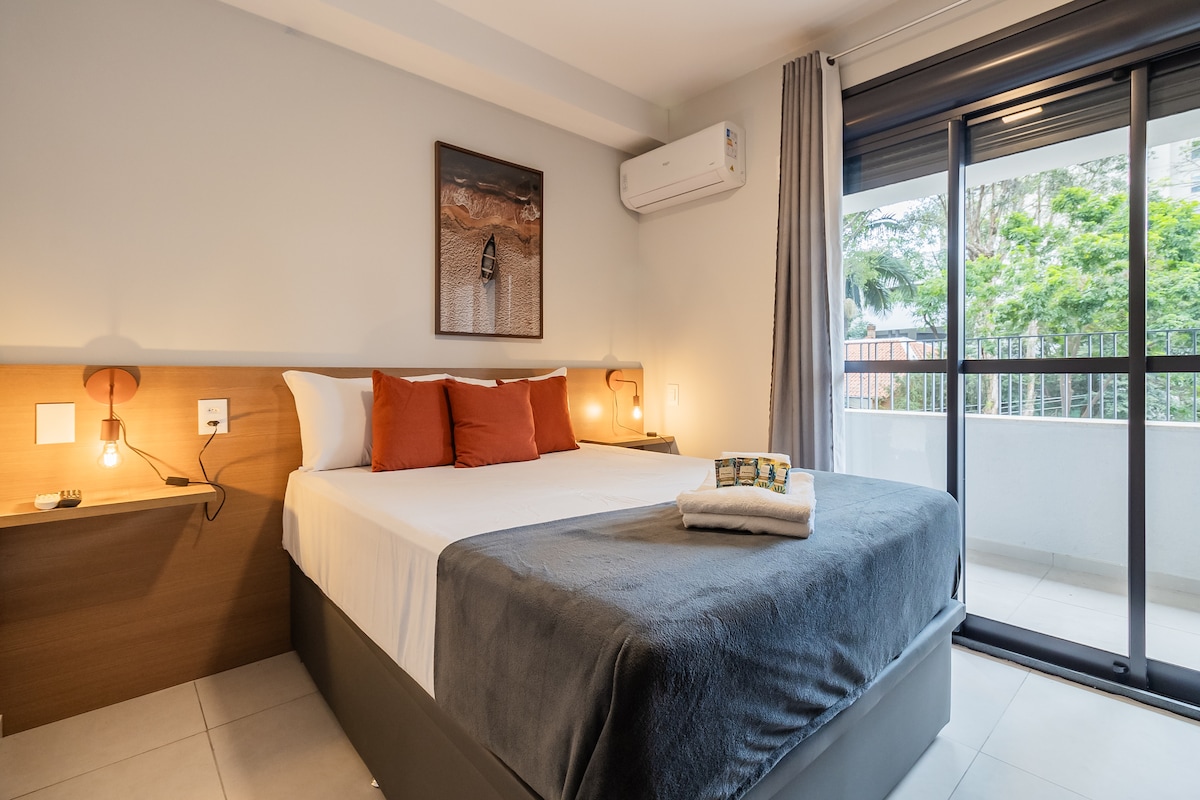 The Premium Studio offers a unique experience in São Paulo, featuring architectural design, high-quality furniture and amenities, conveniently located near Paulista Avenue. ✅ Distinctive Design: Architect-designed project. ✅ Comfort: Emma mattress, 300-thread count sheets, and air conditioning. ✅ Panoramic View: Unobstructed view, 11th floor, glass-enclosed balcony. ✅ Technology: Wi-Fi and Alexa. ✅ Functional Kitchen: Refrigerator, water filter, cooktop, and microwave.
