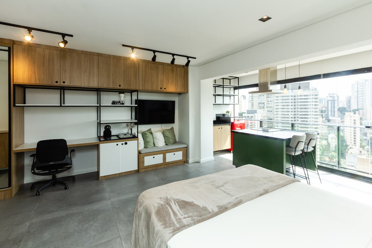 Estúdio espaçoso com muito design, arquitetura e a melhor vista de São Paulo. Loft completo! Com cama queen, closet, ar condicionado silencioso, cozinha completa, home office, WI-FI, TV 55” e uma belíssima banheira de imersão, de onde pode apreciar o seu drink preferido e curtir uma vista apaixonante. São Paulo toda estará há poucos minutos de você. Acesse o metrô andando apenas 200m. Reserve com tranquilidade! Proporcionaremos uma excelente hospedagem e uma ótima experiência!