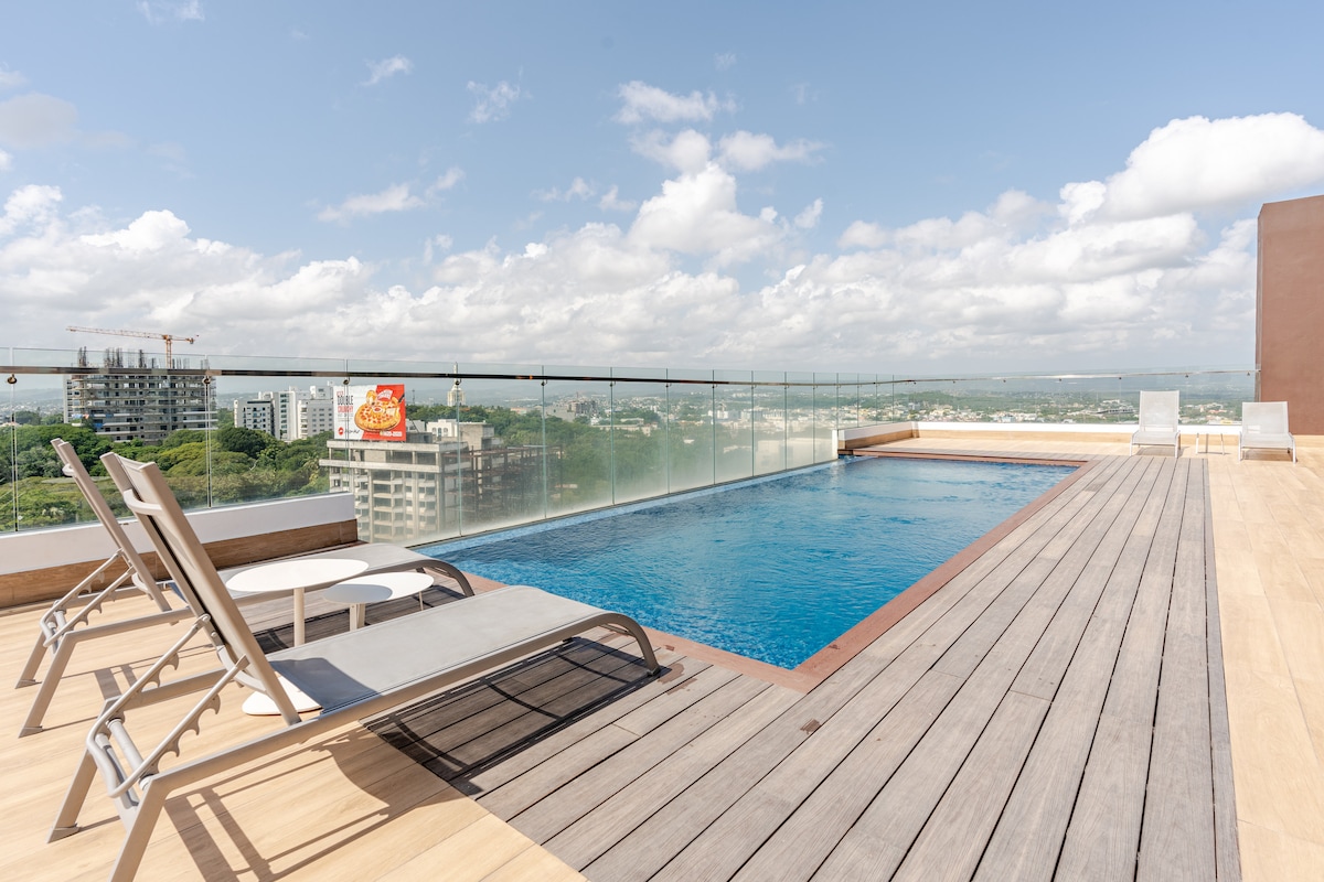 Disfruta de la sencillez de este alojamiento cómodo y en una zona muy céntrica la ciudad de Santiago. Cerca de restaurantes, plazas comerciales y centro de salud, con fácil acceso en cualquier horario. Linda vista de la ciudad desde nuestra piscina y área social.