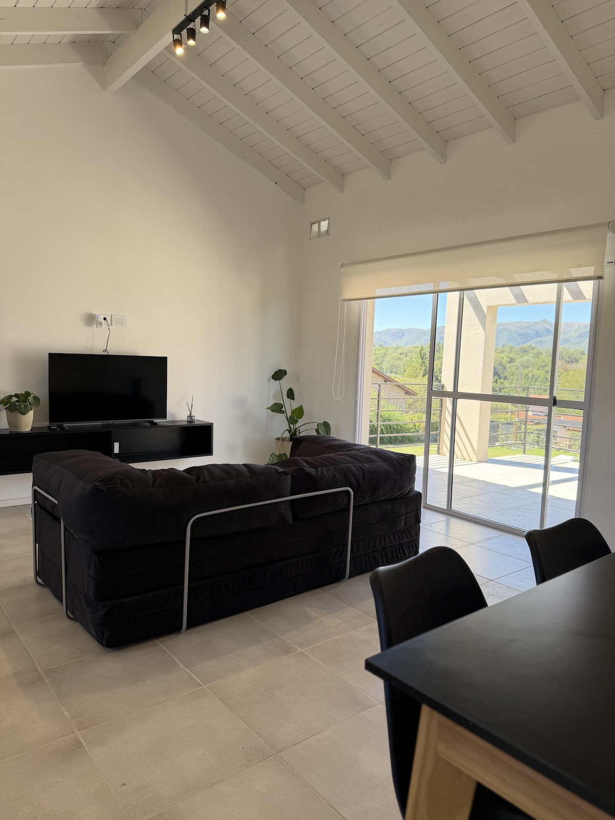 Νέο διαμέρισμα πλήρως εξοπλισμένο με κουζίνα και ψησταριά στο πίσω μπαλκόνι. Διαθέτει 2 υπνοδωμάτια σε σουίτα, το ένα με διπλό κρεβάτι και το άλλο με ένα κρεβάτι 1 θέσης + κουκέτα. Τέλεια διακοσμημένο για να χαλαρώσετε με θέα στα βουνά. Κουζίνα με πλήρη σερβίτσια, συσκευές κουζίνας και σκεύη για να φτιάξετε τα γεύματά σας. Σαλόνι με καναπέ, Smart TV και Wifi. Το διαμέρισμα βρίσκεται στο Barrio Champaqui Golf lot 58, Mza 50. Περιλαμβάνονται σεντόνια.