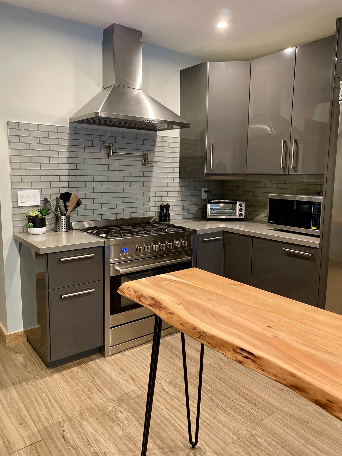Beautifully renovated one floor 2 bedroom modern House across from the beach. Open concept through out dinning room, living room and large gourmet chefs kitchen with seating along island. The bathroom is very large with double sinks and oversized shower. The Master Bedroom is a nice retreat after a long day at the beach or work. King Size bed, luxurious bedding/Smart TV and a work station. The second bedroom is very cozy with a Double bed. BBQ/laundry/keruig/parking and more!