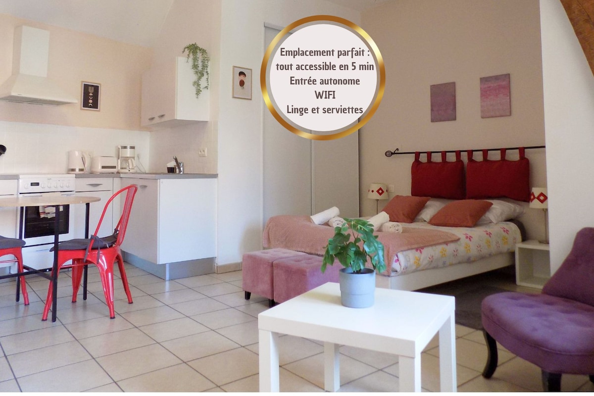 Νέο διαμέρισμα τύπου στούντιο, με φορητό κλιματισμό, πλυντήριο πιάτων, επαγωγική εστία, φούρνο μικροκυμάτων, τηλεόραση, δυνατότητα πρωινού ή σνακ στο φούρνο La Rotonde που απέχει 150 μέτρα. Πολλές δημόσιες θέσεις στάθμευσης σε κοντινή απόσταση, Intermarché, Aldi, βενζινάδικο, κέντρο της πόλης 700 μέτρα, σταθμός 15 λεπτά. Παρέχονται σεντόνια και πετσέτες, καφές και τσάι. Δυνατότητα κράτησης την τελευταία στιγμή, 100% αυτόνομη άφιξη, φτάνετε την ώρα που θέλετε.