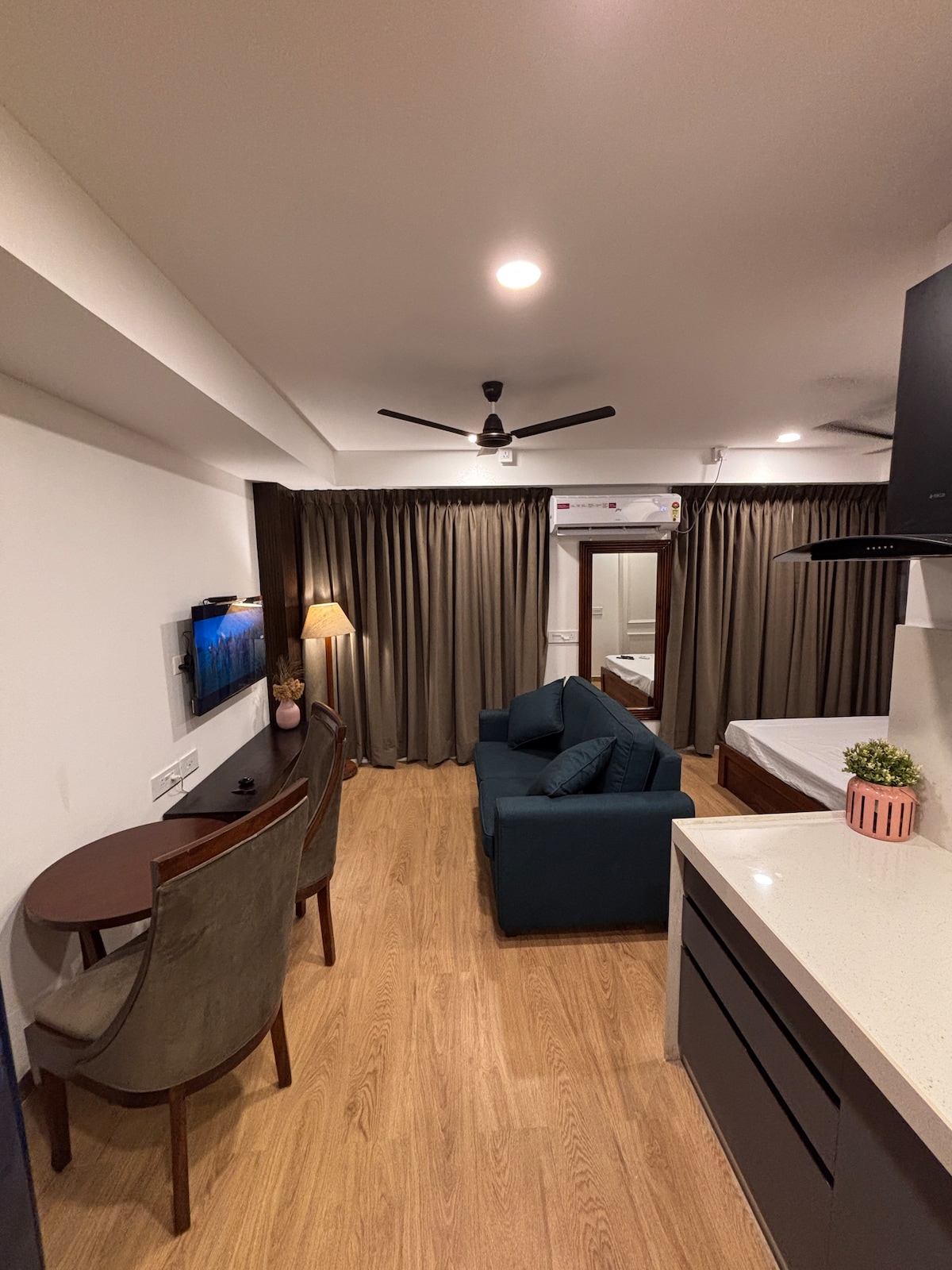 Welcome to Livara, a stylish 1RK apartment just a short walk from the airport. Perfect for solo travelers, couples, or business guests, it offers a blend of comfort and convenience. Enjoy fast Wi-Fi, Air-conditioned comfort, and smart entertainment for a relaxing stay. Thoughtfully designed interiors and a private balcony create the ideal space to unwind after a busy day. At Livara, you’ll feel right at home while staying close to everything you need.