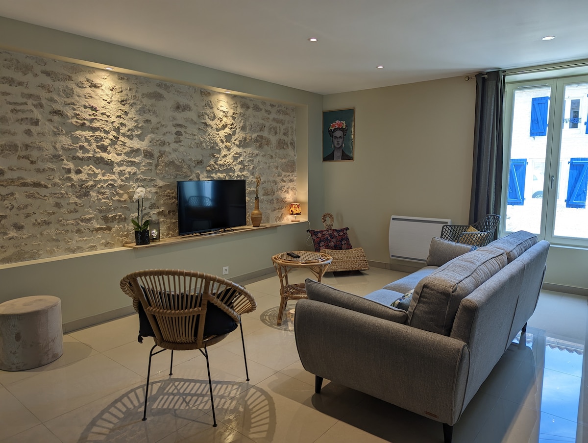 Ελάτε να ανακαλύψετε αυτό το αυθεντικό κατάλυμα με χαρακτήρα στην καρδιά ενός μικρού χωριού με όλες τις ανέσεις σε κοντινή απόσταση 🌿🌿 Αυτό το κατάλυμα βρίσκεται 15 λεπτά από το Ανγκουλέμ και 30 λεπτά από το Κονιάκ 🌳🌼☘️ Αυτό το κατάλυμα στην καρδιά του σπιτιού μας στην περιοχή Σαρέντ βρίσκεται κάτω από μια πέτρινη βεράντα με εκτεθειμένες πέτρες. Αποτελείται από ένα σαλόνι με κουζίνα, καθιστικό και τραπεζαρία, καθώς και ένα μπάνιο στο ισόγειο και ένα ευρύχωρο υπνοδωμάτιο στον επάνω όροφο ☀️☀️ Ιδανικό για δύο ενήλικες και ένα παιδί