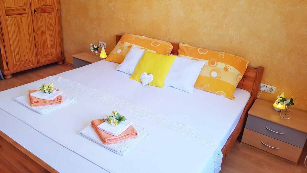 Apartman je na odličnoj lokaciji u obiteljskoj kući u mirnom kvartu i svega 5 minuta šetnje do samog centra grada. Svi apartmani se čiste i dezinficiraju po preporukama airbnba Apartman ima 45 m2 i prostranu terasu od 15 m2. Ispred apartmana je vrtni kamin i veliko parkiralište u dvorištu kuće. Plaža je udaljena 50 m. U blizini su restorani i kafići. Mjesto za iznajmljivanje skutera,auta i brodova je udaljeno 70 m. Igralište za interakciju je u krugu od 100m. luka 200m od kuće Supermarket 100 m.