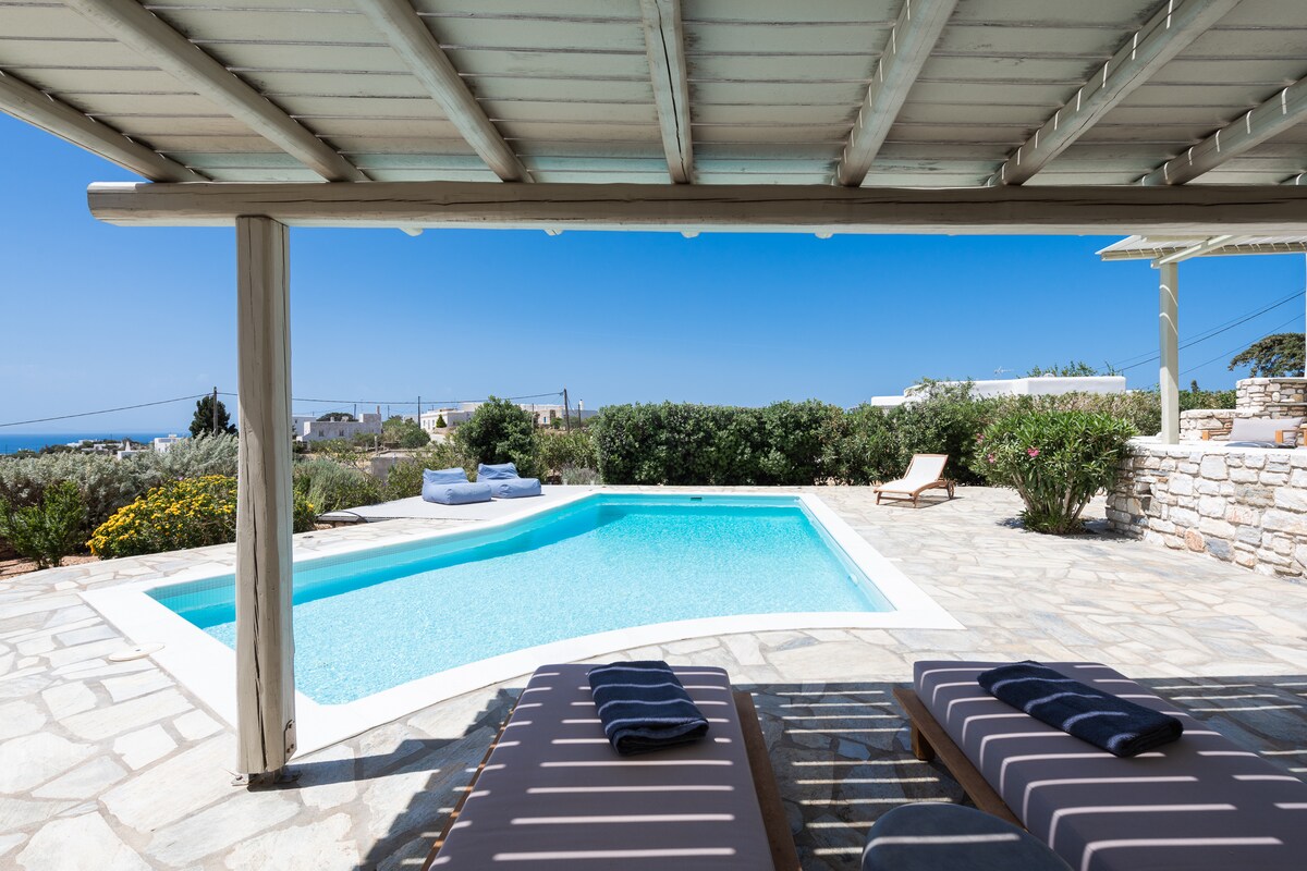 Η βίλα είναι μεσα στην χώρα της Αντιπαρου. Μπορείτε να κάνετε τα πάντα με τα πόδια. Αποτελείτε από 3 συν ένα μικρό υπνοδωμάτιο και 3 μπάνια. Τα δυο υπνοδωμάτια είναι μάστερ, έχουν το μπάνιο μεσα. Αποτελείτε από πλήρης εξοπλισμένη κουζίνα τραπεζαρία και σαλόνι. Επίσης έχει εξωτερική τραπεζαρία ξαπλώστρες και γωνιακό καναπέ. Η πισίνα έχει καταρράκτη και μικρό πισινακι.