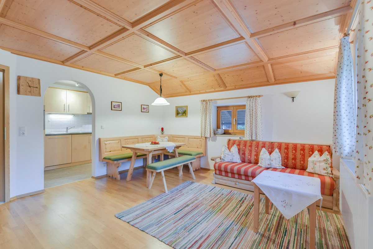 Στη νότια άκρη του Höfen βρίσκεται το άνετο εξοχικό σπίτι. Από το φωτεινό διαμέρισμα διακοπών, που ανακαινίστηκε πρόσφατα, έχετε μια φανταστική, εντελώς ελεύθερη θέα στα βουνά. Μπορείτε να κάνετε διακοπές εδώ με 4 άτομα (εκ των οποίων 2 παιδιά). Το πιο άνετο μέρος του διαμερίσματος είναι το καθιστικό και η τραπεζαρία στο βεράντα που βλέπει νότια. Θα νιώθετε ότι βρίσκεστε μέσα στη φύση. Η κουζίνα είναι πλήρως εξοπλισμένη με πλυντήριο πιάτων, 4 εστίες κεραμικής, φούρνο, τοστιέρα κ.λπ.