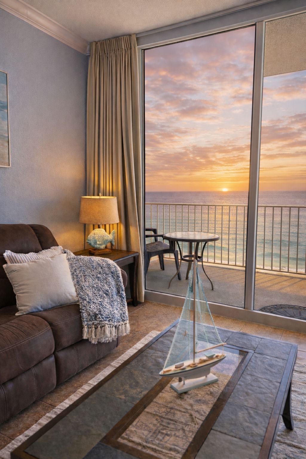 This 7th-floor corner unit condo at Tidewater Beach Resort offers breathtaking panoramic views of the endless shoreline of the emerald Gulf Coast. From the private balcony or the comfort of the living room sofa or dining table, enjoy stunning sunsets over the ocean and dazzling city lights at night. Resort boasts incredible amenities, including two lagoon-style pools, a heated indoor pool, hot tubs, a state-of-the-art fitness center with a Roman spa, a movie theater, and private beach access.