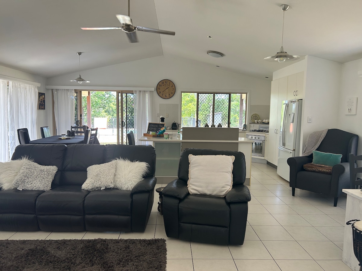 Φωλιασμένο ανάμεσα στο Mt Coonowrin και το Mt Beerwah στα βουνά Glass House. Ευρύχωρο μοντέρνο ενιαίο χώρο που ζει σε ολόκληρο το κάτω επίπεδο του σπιτιού. Ο οικοδεσπότης μένει στον επάνω όροφο, ωστόσο μια ασφαλής πόρτα με ρολά στο κάτω μέρος της εσωτερικής σκάλας διασφαλίζει την ιδιωτικότητά σας. Σκαρφαλωμένο ψηλά σε έναν λόφο με θέα στην ιδιοκτησία. Όμορφη θέα. Φούρνος μικροκυμάτων, μικρό ψυγείο, Nespresso Essenza Mini, Μπάρμπεκιου, Aircon, Σίδερο και σιδερώστρα, Δική σας είσοδος από εξωτερικές σκάλες. Βρίσκεται σε 250 στρέμματα με καγκουρό, ορνιθοπανίδα και γραφικά φράγματα
