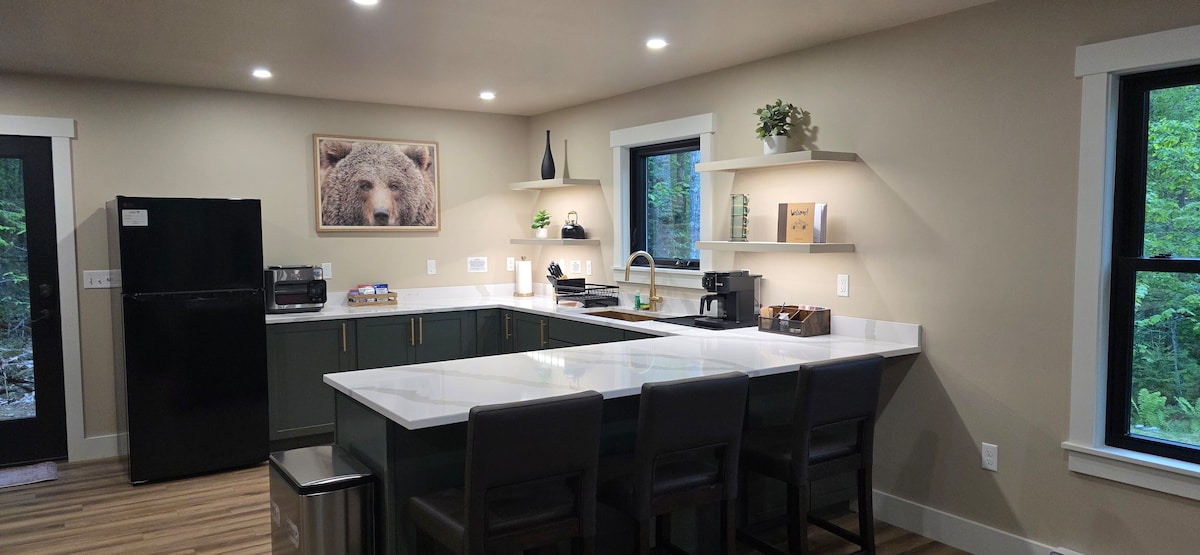 Το νεόκτιστο, μοντέρνο ξυλόσπιτό μας προσφέρει ένα απομονωμένο και χαλαρωτικό καταφύγιο στο Γιούνιον του Μέιν. Με τα ψηλά ταβάνια, την ανοιχτή διαρρύθμιση και τα πολλά παράθυρα, οι επισκέπτες περιβάλλονται από φυσικό φως και θέα στο δάσος. Το ξυλόσπιτο διαθέτει πλήρως εξοπλισμένη κουζίνα, άνετο τζάκι, υπαίθρια ψησταριά και τζάκι. Τα μονοπάτια πεζοπορίας συνδέουν το ξυλόσπιτο με τη φάρμα μας δίπλα, όπου μπορείτε να επισκεφτείτε τα άλογα, τα γαϊδούρια, τις κατσίκες, τις κότες και τις πάπιες μας. Βρισκόμαστε μόλις 25 λεπτά από τα καταστήματα, τα εστιατόρια και τις παραλίες του Midcoast.