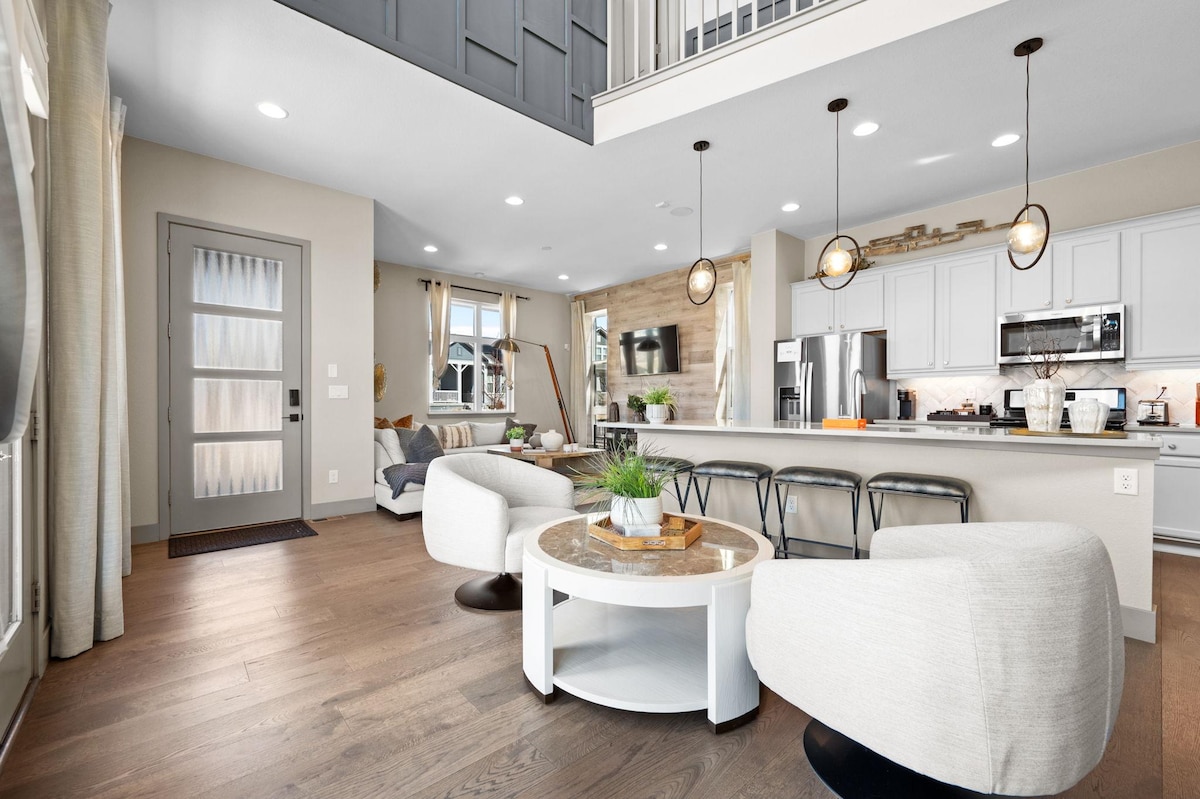 Modern 2-bedroom and 2-bath home just 10 minutes from Denver Airport and 5 minutes from Gaylord Resort! Enjoy an open living space, a fully equipped kitchen, fast WiFi, a smart TV, in-unit laundry, and a private garage. Relax in a quiet, safe neighborhood with easy access to downtown Denver, parks, and dining options. Perfect for families, business trips, or a fun getaway, book your comfortable stay in Denver today! Relax or unwind in the great room after a day of exploring the Mile High City.