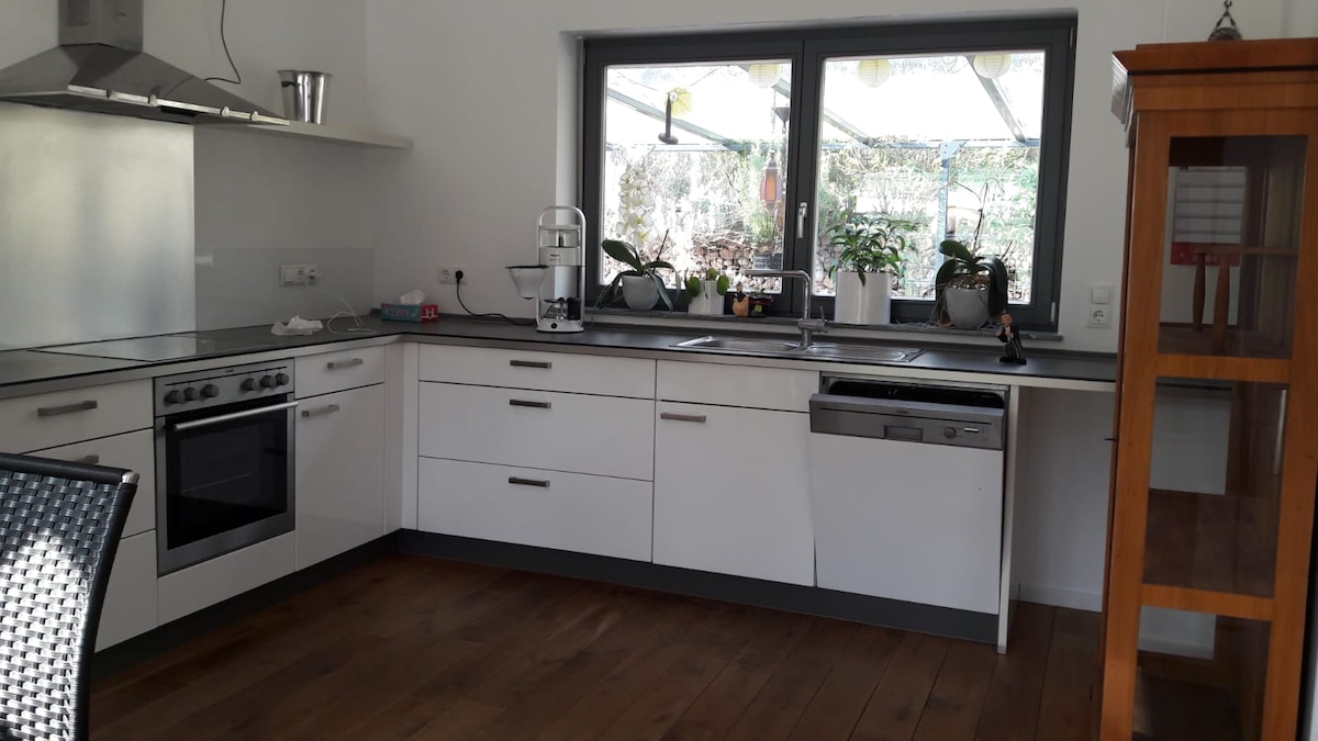 Uniquely beautiful, contemporary, light flooded, wide open space, huge glass sliding doors, modern and well equipped kitchen, gallery opens view from first to ground floor and vise versa, 2 modern bathrooms with ground even shower, modern fire place for cosy atmosphere, rural surrounding, fast access to Frankfurt. Ideal location for Frankfurt fair visitors.